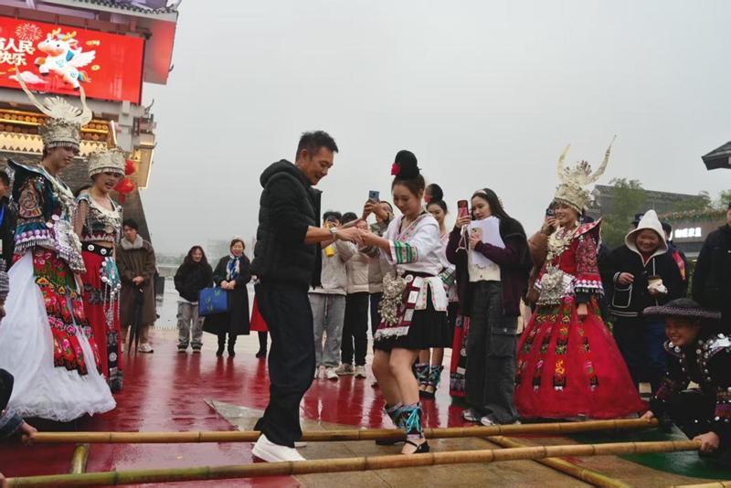 随后,港星们在鼓楼前留下了珍贵的合影,镜头定格了这一美好瞬间。紧接着,一场别开生面的民族特色互动环节拉开帷幕。大家随着少数民族音乐节奏勇敢跳跃竹竿舞,体验“东方的健美操”的乐趣,现场欢声笑语不断,拉近了嘉宾与多彩贵州城的距离。